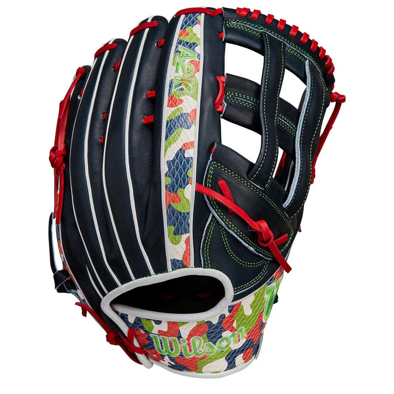 The brand new 2025 Fall Edition Michael Harris 12.75” outfield glove offers a Navy Blue Pro Stock® Select leather and Red, Blue & Neon Green SuperSnakeSkin™. This model is designed for Outfielders looking to expand their reach.