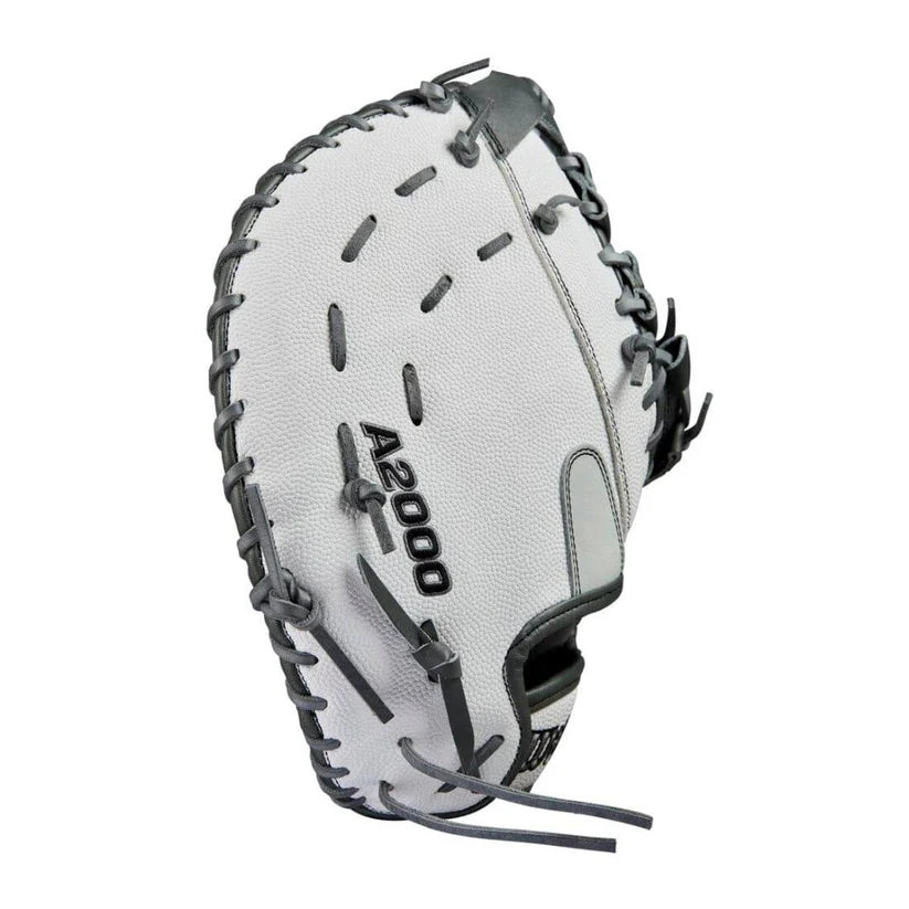 The Fastpitch Classics Series A2000 1620FPSS first base mitt features a Single Post Web and large 12.5” reach required to pick low throws in the dirt or stretch for hard-hit balls down the first base line. With a single break point design, the A2000 1620FP is easy to handle while anchoring the infield. Equipped with a drawstring wrist closure, this first base mitt is easy to adjust in game for a secure fit. Pro Stock® leather delivers an enduring appearance and performance players prefer while White SuperSkin™ reduces glove weight, repels moisture and improves durability.