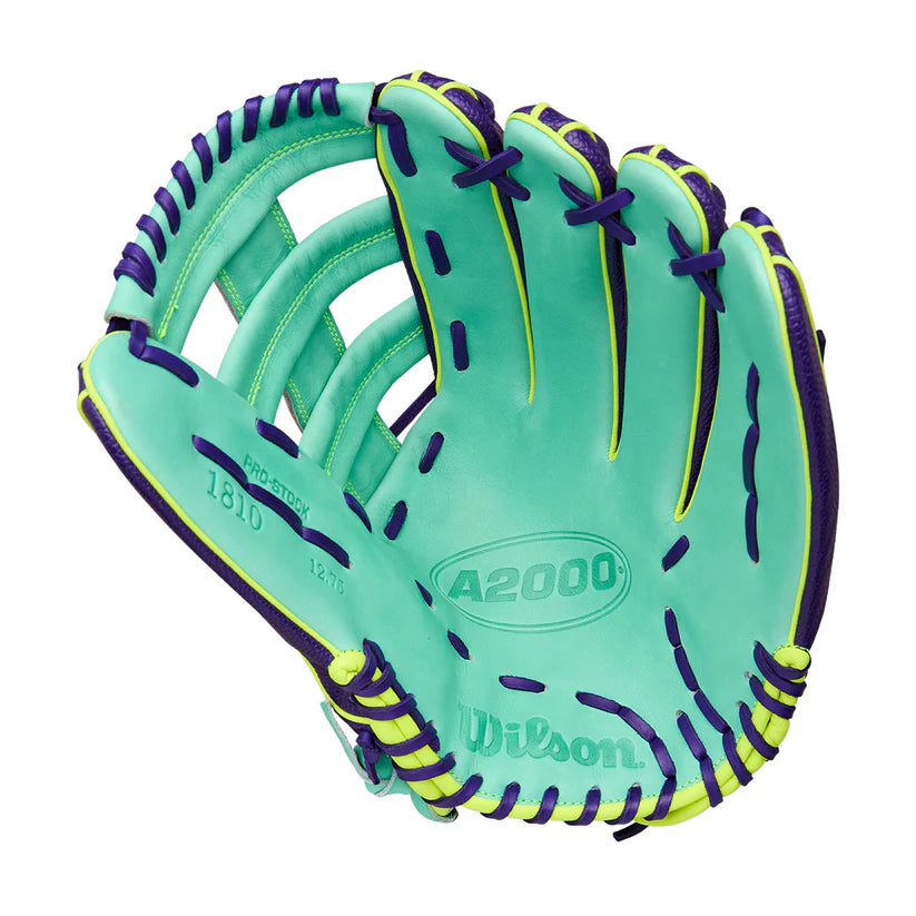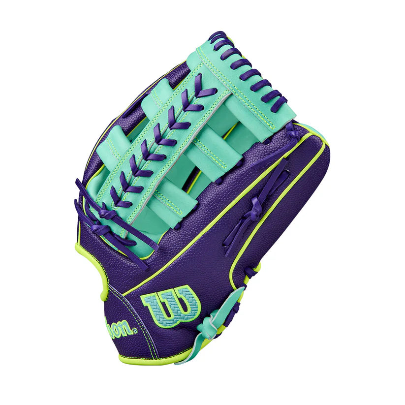 The long 12.75” reach and Single & Double Bar Web make it easy to track down deep fly balls and secure tough catches on the move. Crafted with Seafoam Pro Stock® leather, the glove delivers unmatched durability and feel, while bold Purple SuperSkin™ on the back repels moisture and reduces weight—perfect for diving plays on wet grass or in the rain.