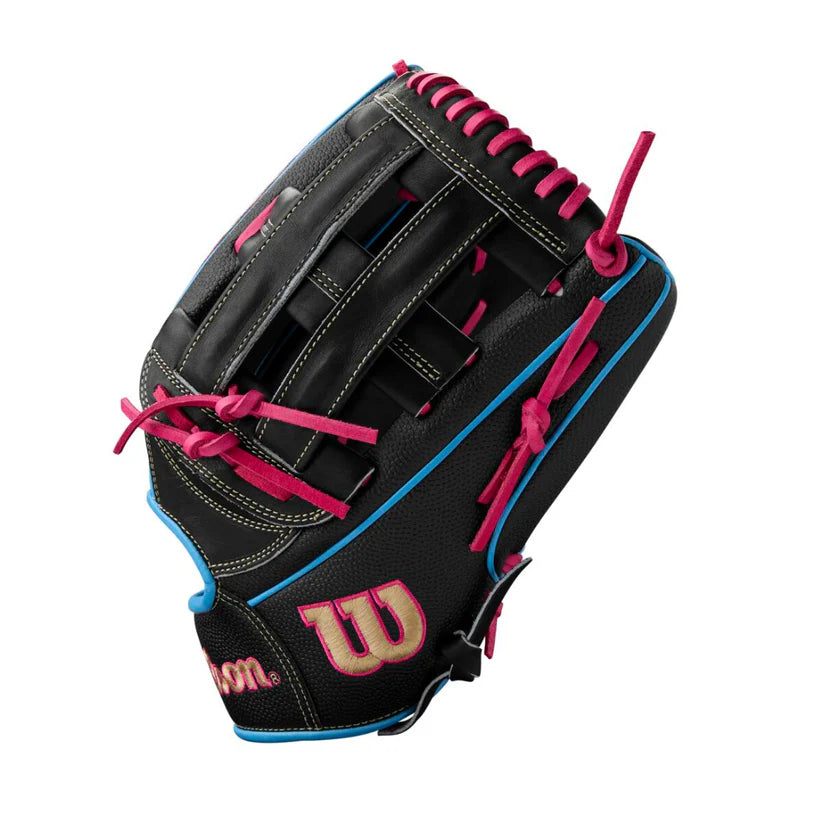 Extend across the outfield grass with the high-flying Summer 2025 A2000® 1777SS, a 12.75-inch glove optimized for outfielders to achieve optimal jump and prevent balls from dropping between the foul lines. Lightweight Black SuperSkin™ repels moisture from rain or wet grass, ensuring outfielders can continue their hustle through inclement weather. A Black Pro Stock® leather palm and sturdy Dual Post Web provide enduring comfort and performance while maintaining its shape during challenging catches at the wall. The A2000 1777 has a narrower heel compared to the similar A2000 1799 glove model, resulting in a secure fit when reaching for sinking line drives.