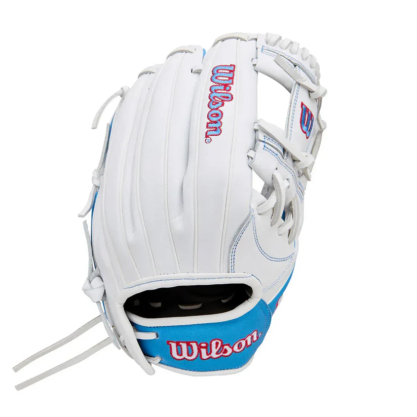 Finished in a sharp White / Cool Blue / Red colorway, this glove brings pro-level detail and performance to young fastpitch infielders looking to elevate their game.