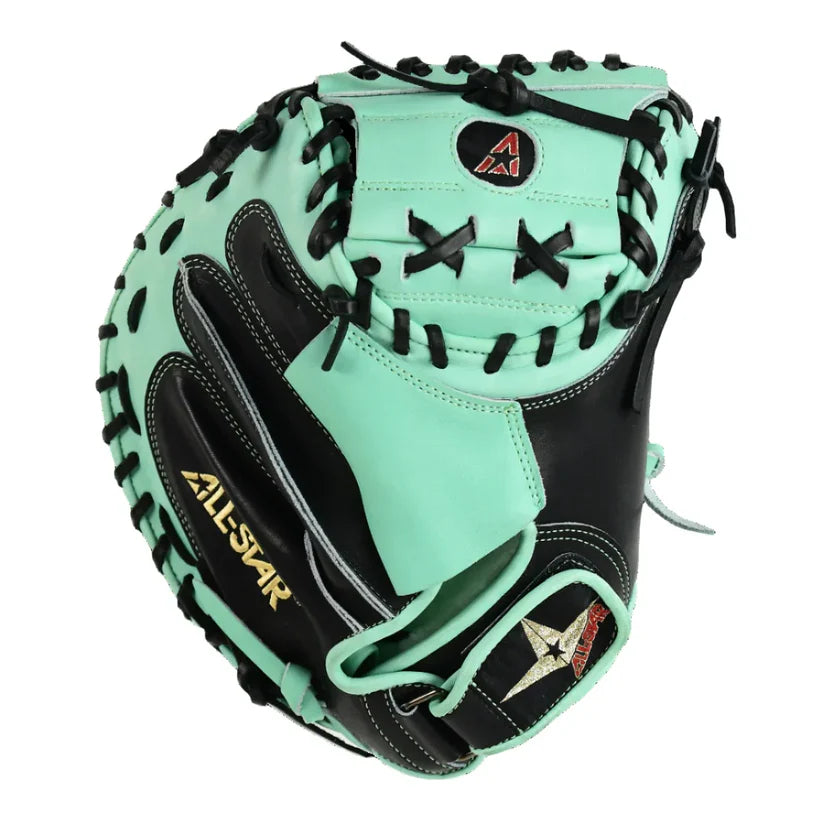 The All Star Pro Elite Baseball Catcher's Mitt offers a large 34-inch Mitt Size; two piece closed web, black and mint colorway, and offers an adjustable velcro wrist strap for the perfect fit.