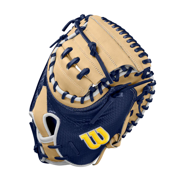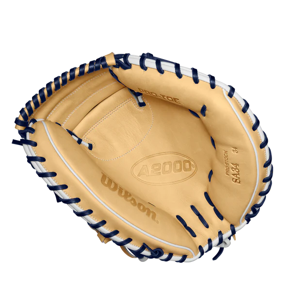 The Winter 2024 A2000® SA34SS, an updated catcher’s mitt with thinner toe pads along the fingers, offers modern travel ball, high school & college catchers total control while receiving the ball. The mitt’s index finger pad extends into the wrist opening, resting between the catcher’s index finger and the leather palm for enhanced comfort through countless bullpens and in-game innings. A 34” Blonde Pro Stock® leather palm creates a larger target, and the Half Moon Web helps secure fastballs or block breaking balls in the dirt. Navy Blue SuperSnakeSkin™ sheds weight while repelling moisture on rainy days.