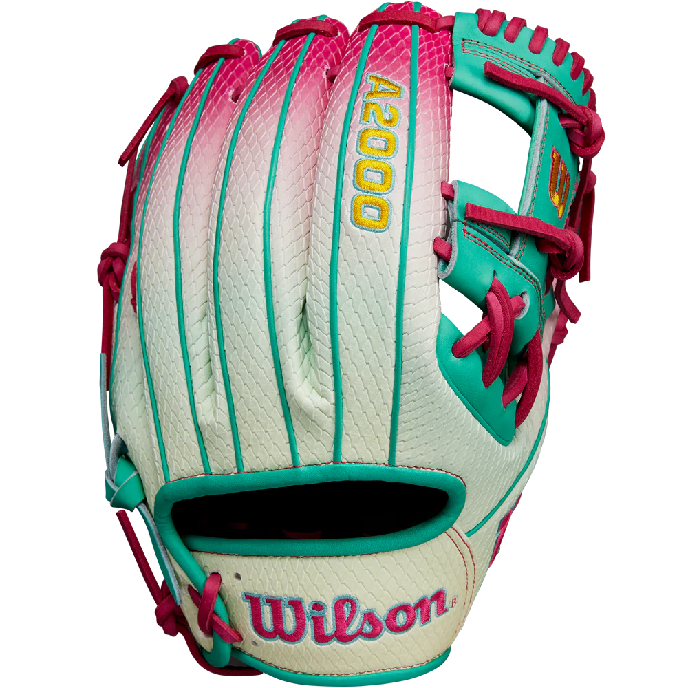 Showcase summer style with this A2000® 1975, using SuperSnakeSkin™ that features a Pink to Seafoam gradient. The Seafoam Pro Stock® leather palm features a deeper pocket to secure the ball at second, third or shortstop.