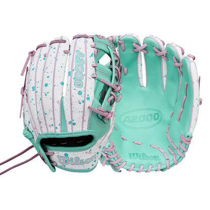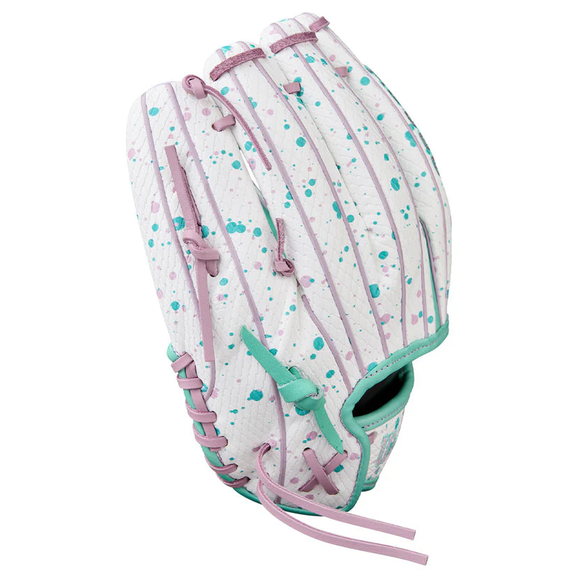 Make a splash on the dirt. The Winter 2025 Wilson A2000® FP75SS brings an 11.75" fastpitch infield pattern with a deep, stabilized pocket and a Single Post Web (3X Lace) to snag hot shots at SS/3B. A Seafoam Pro Stock® Leather palm delivers long-lasting feel, while White SuperSnakeSkin™ with Seafoam splatter keeps things lightweight, moisture-resistant, and easy to clean. Inside, Comfort Pro™ Fit (ProLux™ lining + Comfort Sleeve), Flat Finger Binding, and an adjustable Drawstring wrist lock in all-game comfort and control.