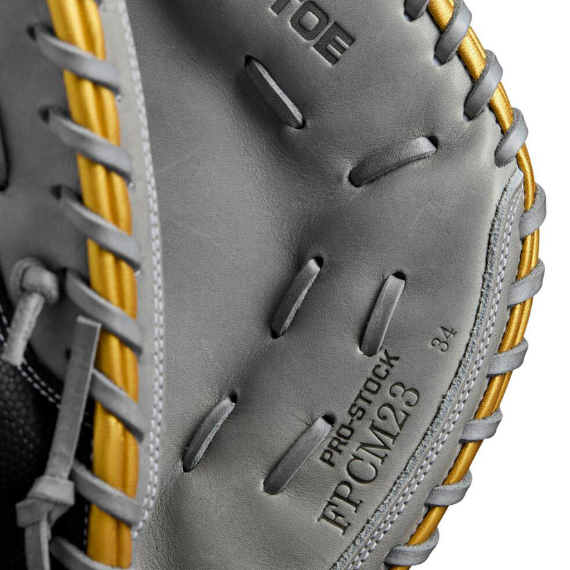 Steal strikes for your pitcher and control the game with the Spring 2025 A2000® FPCM23SS, a fastpitch softball catcher’s mitt designed with thinner toe pads and a larger palm for improved receiving. This A2000’s Grey Pro Stock® leather, extended palm and Horizontal Hinge Web creates the ideal target behind home plate, making it easy for catchers to secure everything from the high rise ball to the low drop ball. Black SuperSkin™ on the back of the mitt creates a lightweight feel, and Gold accents help catchers flash the leather.