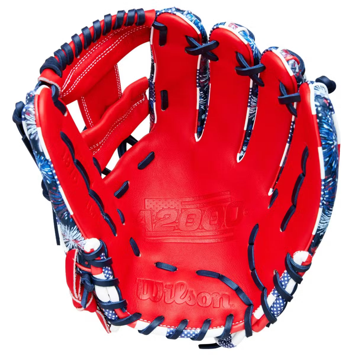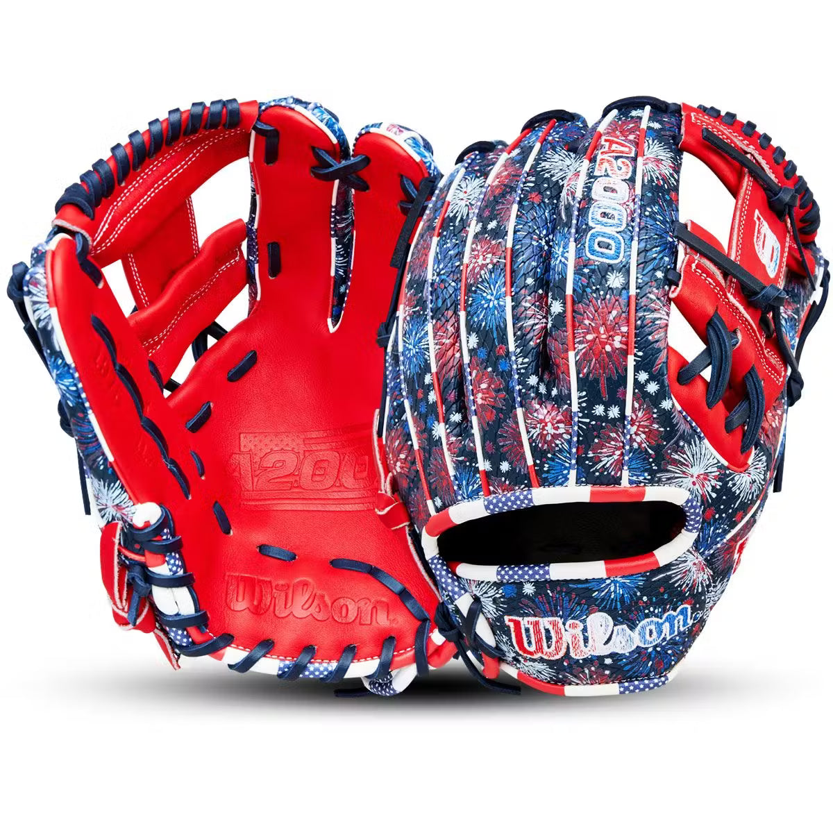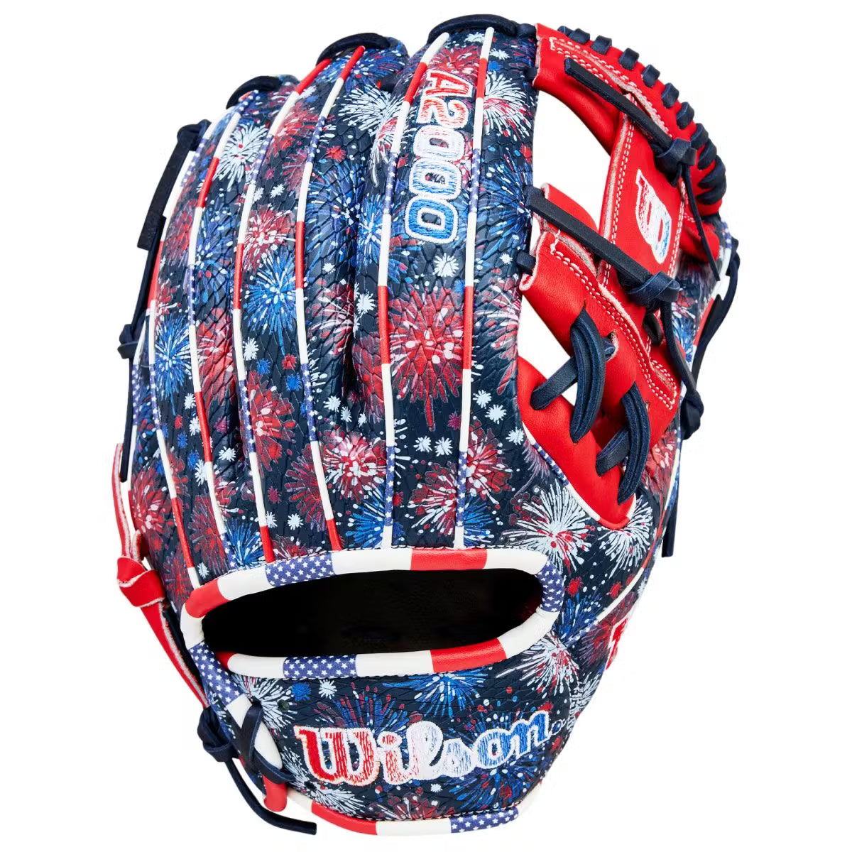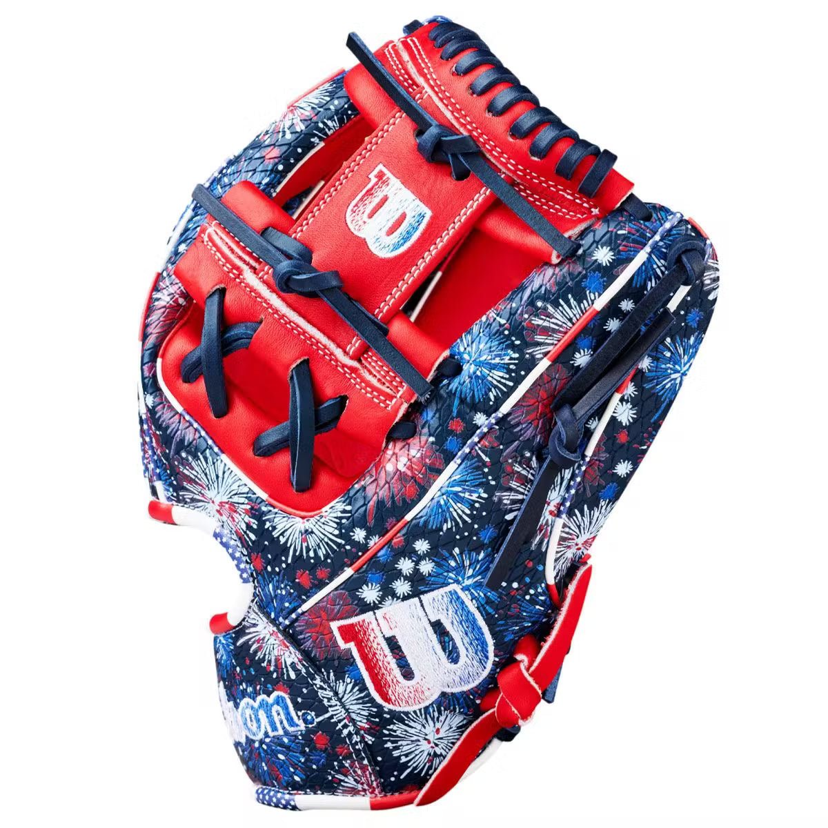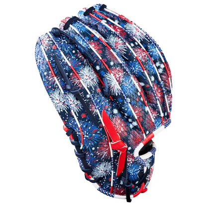Let freedom ring with the Wilson A2000 July 2025 GOTM Firework Infield Glove, a dazzling limited edition piece from the Wilson Glove of the Month series. Designed with the 1975 pattern and measuring 11.75 inches, this glove is perfect for infield players seeking exceptional performance. Its vibrant red, white, and blue colorway, paired with an I-Web design, ensures standout style on the field. Crafted from premium Pro Stock Leather and featuring SuperSnakeSkin, this glove offers superior durability and shape retention with its Rolled Dual Welting. The conventional open back wrist and ultra-breathable Dri-Lex lining provide a comfortable fit, making it a top choice for serious infielders.