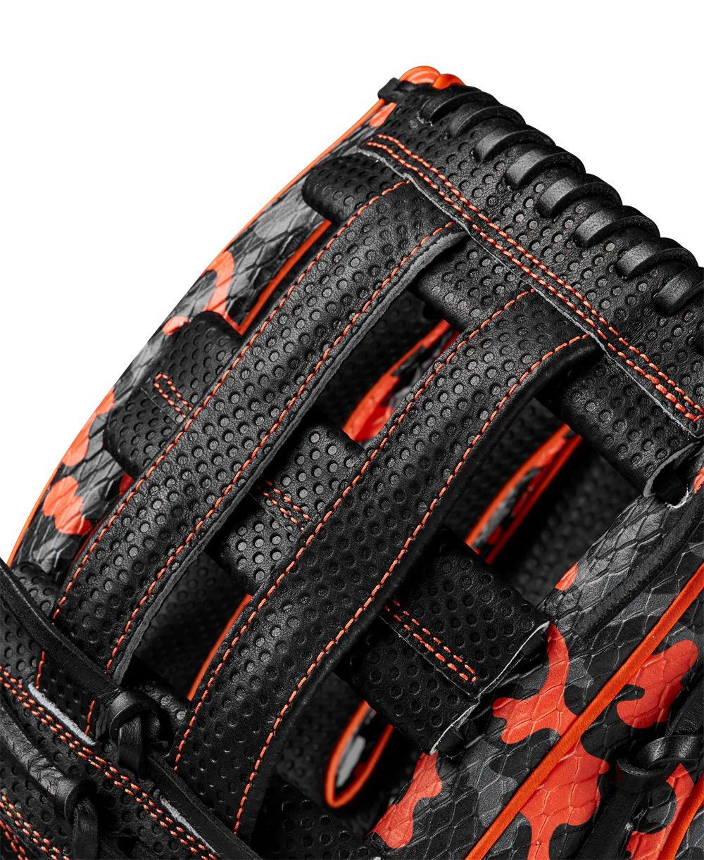 Bring the spooky vibes with this A2000® 1777–a newer outfield glove model based on the A2000® 1799 with a narrower heel for a more secure fit. Orange, Black and Grey Camouflage SuperSnakeSkin™ reduces weight and Spin Control Technology™ grips the ball in the Pro Stock® leather palm.